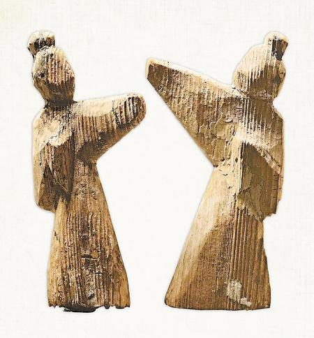 舞俑有獨(dú)舞俑和對舞俑兩種組合,舞者主要通過手臂的屈伸表現(xiàn)出舞蹈姿勢。通常先雕出舞俑姿態(tài),然后以白色為底色,用墨線和紅線繪頭發(fā)、衣袖,下垂處呈圓角方形。面部五官基本被省略,主要突出的是動(dòng)態(tài)的翩翩舞姿。高度通常在20厘米左右。