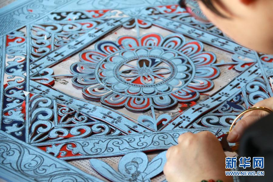在甘肅敦煌小鎮(zhèn)鳴沙書院,“敦煌剪紙”酒泉市級(jí)非物質(zhì)文化遺產(chǎn)代表性傳承人莊生娟在自己的工作室內(nèi)創(chuàng)作(2020年12月31日攝)。新華社發(fā)(張曉亮 攝)