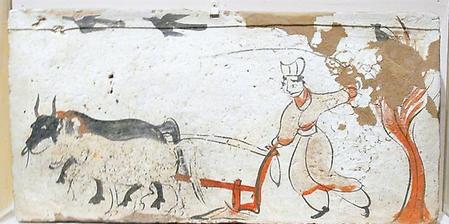此后,在酒泉丁家閘十六國墓壁畫中就只有一牛牽引的雙轅犁了。說明魏晉時期是中國從二牛單轅犁過渡到一牛挽拉雙轅犁的時代,這一過渡的狀況及特點出現(xiàn)在嘉峪關地主墓葬壁畫中,又說明甘肅是這一重大農(nóng)技改革的地區(qū)之一。