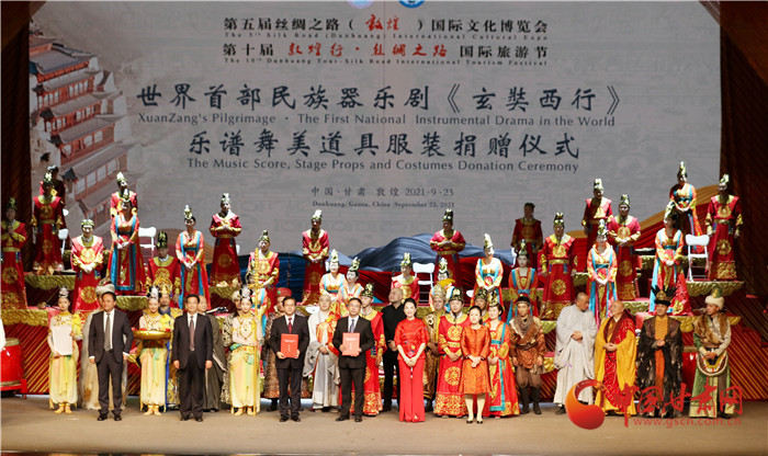 演出結(jié)束后,現(xiàn)場(chǎng)舉行了簡(jiǎn)潔而隆重的“大型民族器樂(lè)劇《玄奘西行》樂(lè)譜舞美道具服裝捐贈(zèng)儀式”,中央民族樂(lè)團(tuán)將價(jià)值360萬(wàn)元的樂(lè)譜、舞美、道具和服裝捐贈(zèng)給甘肅演藝集團(tuán)歌舞劇院,并指導(dǎo)甘肅省文藝院團(tuán)將民族器樂(lè)劇《玄奘西行》打造成為弘揚(yáng)絲路精神、推動(dòng)絲路文化交流融合的經(jīng)典劇目。中央民族樂(lè)團(tuán)作為海內(nèi)外規(guī)模最大、藝術(shù)最完備的綜合性國(guó)家級(jí)民族音樂(lè)表演團(tuán)體,對(duì)甘肅文藝事業(yè)和地方樂(lè)團(tuán)創(chuàng)作發(fā)展和人才培養(yǎng)給予大力支持,為甘肅文藝事業(yè)發(fā)展做出了重大貢獻(xiàn)。