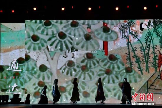 10月16日晚,敦煌國際時尚周在鳴沙山月牙泉景區(qū)開幕,張肇達·張凱惠攜手的作品在這里進行了展演秀。圖為敦煌服裝秀展示。 殷春永 攝