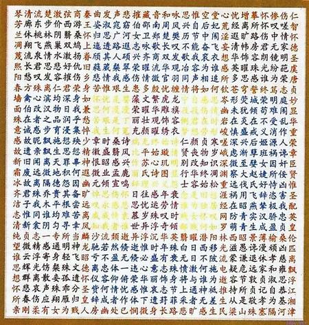 蘇蕙《璇璣圖》不僅是一束厚重的文學(xué)奇葩,也是一幅充滿創(chuàng)意的藝術(shù)巨制。她將詩歌的載體從傳統(tǒng)簡帛紙張轉(zhuǎn)換成為錦。錦是有彩色花紋的高級絲織品。以錦為書寫材料制作《璇璣圖》,除詩歌本身的創(chuàng)作外,首先需要染絲紡織。錦織好后,又要對《璇璣圖》謀篇布局,劃區(qū)設(shè)色,書詩于錦,然后一針一針地將它繡出來,變?yōu)榛匚腻\字。那每一道工序,要求都極精細(xì),不得有半點疏忽,不然就會留下污點和遺憾。蘇蕙集眾藝于一身,完美地將其制作出來,體現(xiàn)了她的綜合藝術(shù)才能。取名“璇璣(泛指北斗)圖”,寓意它像北斗,可以旋轉(zhuǎn)地讀。它是在華美的錦上,又以五彩繽紛的絲線繡上《璇璣圖》,不僅顏色更加艷麗,而且那841個金玉珠璣般文字,展現(xiàn)的令人眼花繚亂的詩歌園地,更是前不見古人,后不見來者,比錦繡的光彩更加耀眼奪目。