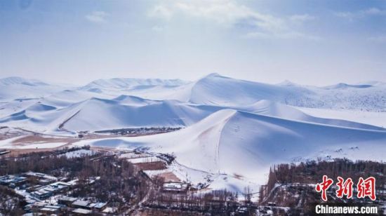 11月20日凌晨,甘肅敦煌降下2021年入冬以來的第一場雪。當日上午10時左右,敦煌大漠雪后天氣放晴,被白雪覆蓋著的大漠山川銀裝素裹顯得分外妖嬈,遠遠望去鳴沙山白雪茫茫,沙雪交融,美景如畫,呈現(xiàn)出難得一見的北方雪國風情。