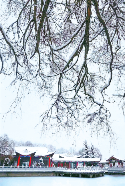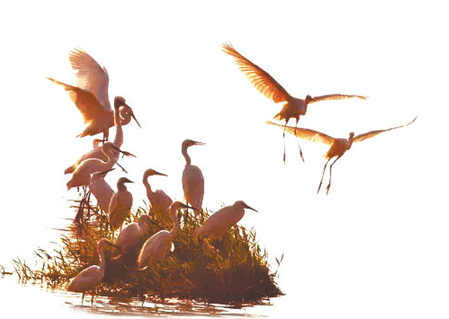 去年12月底,一位老師來(lái)西峰講學(xué),我陪先生到濕地海綿公園轉(zhuǎn)悠,剛剛步入人行道,發(fā)現(xiàn)遠(yuǎn)處湖水中央有七八只白鷺在棲息,朝陽(yáng)斜射到湖面上,水波瀲滟,像細(xì)碎的金斑,白鷺安詳?shù)叵礈熘鹈?,有一只白鷺單腿直立著,恰似依著一根筆直纖細(xì)的鐵絲,半張著翅膀,欲飛不飛的樣子,剩下的幾只白鷺在戲水,迷人極了。