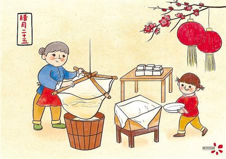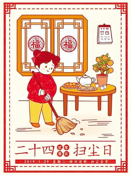 據《呂氏春秋》記載,這一風俗源于堯舜時代。臘月二十四那天,隴上人家就陸續(xù)開始打掃起來,全家老少一起動手,清掃房屋積塵,石灰刷墻,新紙裱糊仰塵,擦洗窗欞,糊上新窗紙,貼窗花或貼“窗孔子”(微型花鳥畫與書法),擦拭箱柜上的銅什件、器皿污垢,打氈抖土,拆洗被褥。一番流汗勞碌,居室煥然一新,過年的心情也更加舒暢。