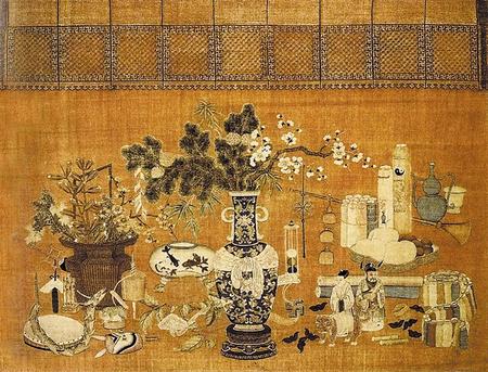 此畫流傳到清代,宮廷畫師董誥據(jù)此繪制了一幅仿圖,乾隆皇帝又以后者為靈感定制了一幅緙絲歲朝圖。