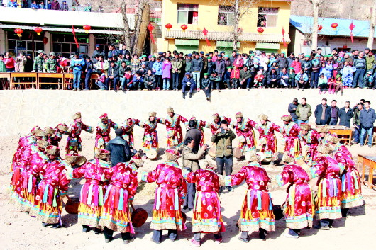 在岷縣,巴當(dāng)舞只在中寨鎮(zhèn)的古莊村、扎那村牙地社和一路村流傳,尤其古莊村最為鼎盛且具規(guī)模。這里毗鄰卓尼縣藏巴哇鎮(zhèn),藏漢兩地僅一公里之遙,情感相連,民心相通。長期以來,群眾在經(jīng)濟(jì)、文化、婚姻等方面交流密切。時(shí)至今日,扎那、古莊等村群眾春節(jié)吃肉仍遺留著藏民族彪悍豪爽的風(fēng)格:一大盤“手把肉”端上來,上面插一把小刀,客人可以自削自啖,這種神秘的文化符號(hào)似乎無聲訴說著藏漢兩地的過往、發(fā)展和變遷……