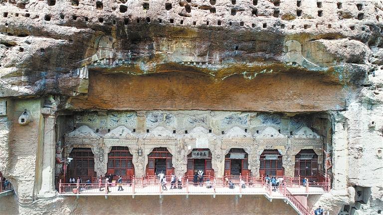 麥積山石窟第4窟,俗稱“散花樓”。位于東崖上部,又名“上七佛閣”,是麥積山石窟最為宏偉壯觀的一個洞窟。此窟開鑿于北周(公元557年-581年)時期,根據(jù)史籍記載為秦州大都督李允信為其亡父祈福所建造的“功德窟”。通高16米,橫寬31.7米,進深13米。其形制為七間八柱仿木構(gòu)崖閣式宮殿建筑。因地震等自然因素的破壞,洞窟前半部分坍塌,前廊六根柱廊崩毀,僅存七龕及部分梁柱尚保存完好。