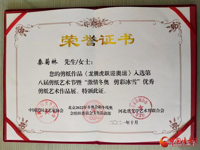 2021年11月由中國民間文藝家協(xié)會、河北省文學藝術界聯(lián)合會主辦,河北省民間文藝家協(xié)會、中共蔚縣人民政府承辦的“第八屆剪紙藝術節(jié)暨激情冬奧.剪彩冰雪”優(yōu)秀剪紙藝術大賽中,剪紙作品《龍騰虎躍迎奧運》榮獲優(yōu)秀收藏作品同時被河北省蔚縣博物館永久收藏,并頒發(fā)收藏證書。