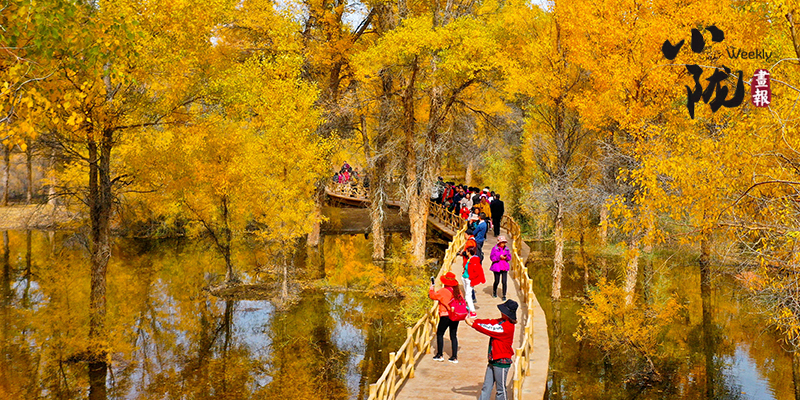 漫步林中,就仿佛進(jìn)入神話中的仙境。茂密的胡楊干奇百怪,神態(tài)萬(wàn)般。粗壯、滄桑的胡楊幾個(gè)人難以合抱,挺拔的有七八丈之高,怪異的似蒼龍騰越、虬蟠狂舞。每一棵高大的樹冠枝頭,間或又有淺綠、淡黃的葉片在閃現(xiàn),錯(cuò)落有致,色彩繽紛,滿眼的赤橙黃綠與盈盈秋水互相映襯,令人嘆為觀止。