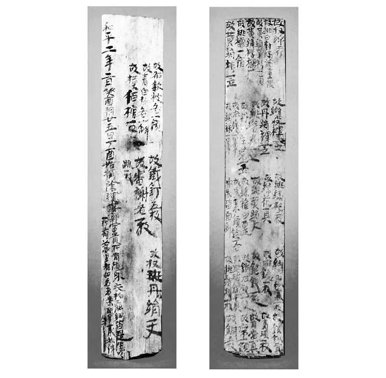 衣物疏木質(zhì),保存基本完好,長(zhǎng)37.2厘米,寬6.5-6.9厘米,厚0.6-1.1厘米。衣物疏在墓中的主要作用是記載墓主隨葬衣飾和物品的名稱及數(shù)量。由于保存較好,此衣物疏上的字跡至今清晰可辨。衣物疏背面有“和平元年姑臧陰漢妻郭富貴”字樣,據(jù)此內(nèi)容可知這件衣物疏為前涼姑臧(今武威)居民陰漢之妻郭富貴亡故后的隨葬衣物疏,且極有可能出土于姑臧(今武威)。