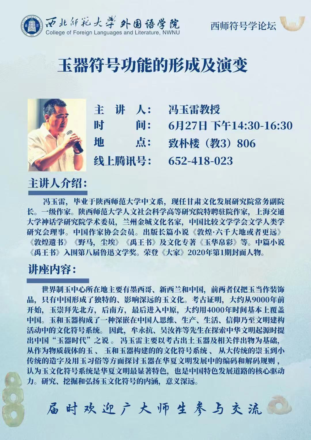 由甘肅文化發(fā)展研究院常務(wù)副院長、一級作家馮玉雷主講的《玉器符號功能的形成及演變》將于6月27日下午在西北師范大學(xué)舉辦。此項活動是西北師范大學(xué)外國語學(xué)院西師符號學(xué)論壇系列講座之一,旨在促進玉文化與符號學(xué)的融合研究。