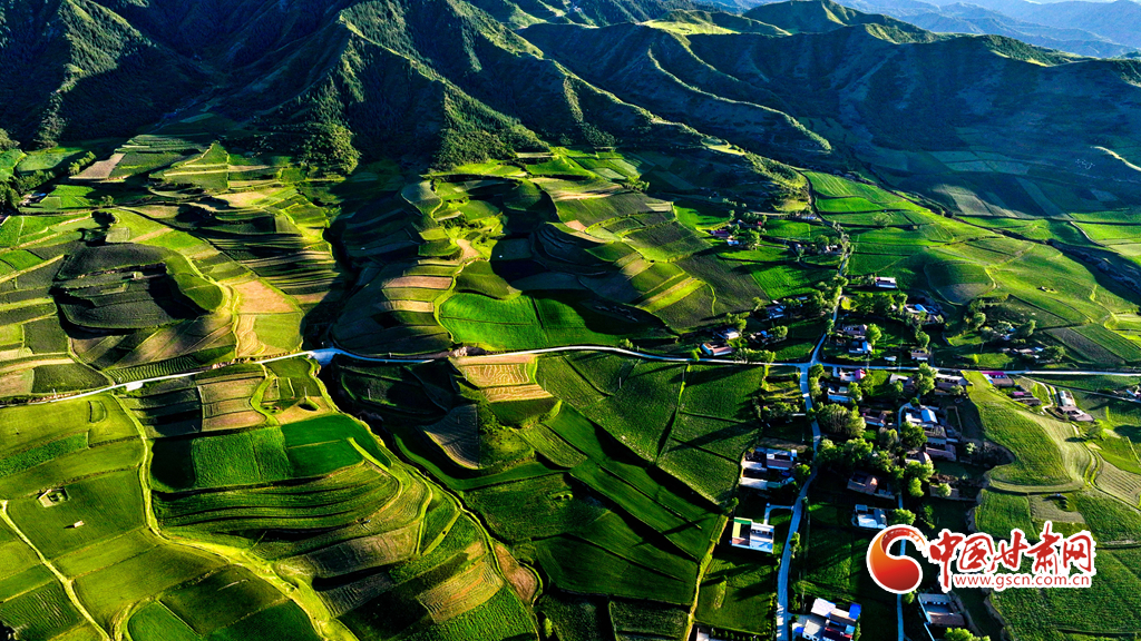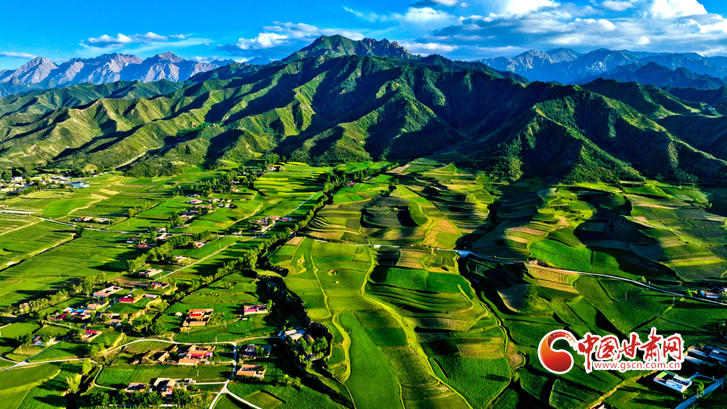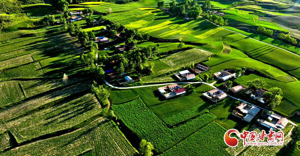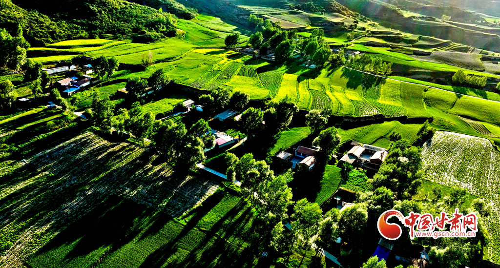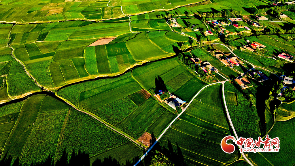 夕陽(yáng)映襯下的祁連山北民樂縣豐樂鎮(zhèn)易家灣村,綠油油的莊稼生長(zhǎng)旺盛,林木蓊郁層林盡翠,呈現(xiàn)出生機(jī)勃勃的景象,猶如“巨幅綠毯”。