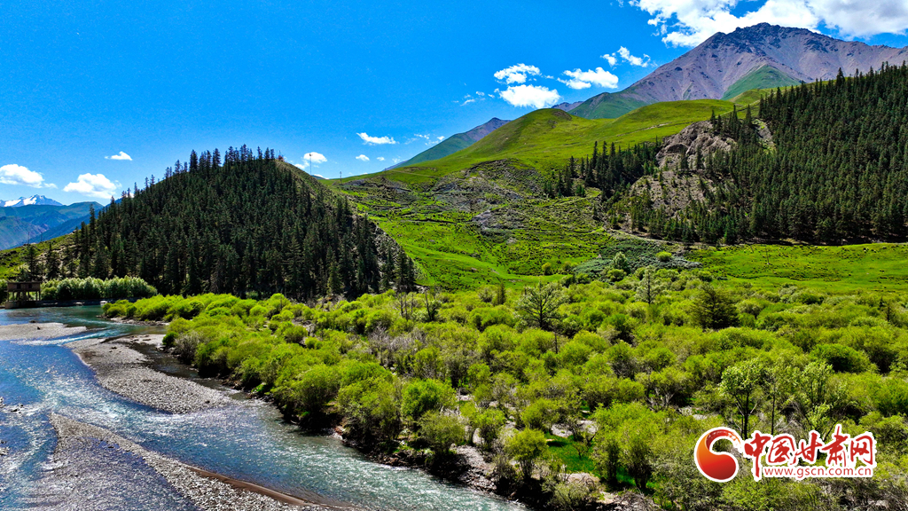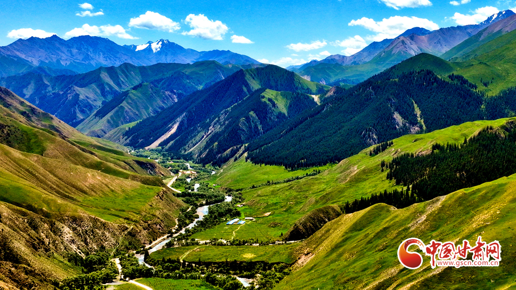 7月22日,祁連山國(guó)家公園甘肅省張掖市肅南裕固族自治縣大河鄉(xiāng)段,藍(lán)天白云下,巍峨壯麗的祁連山蒼松翠柏矗立其間,綠草如茵、水光粼粼,如同一幅壯美與秀麗并存的山水畫(huà)卷。