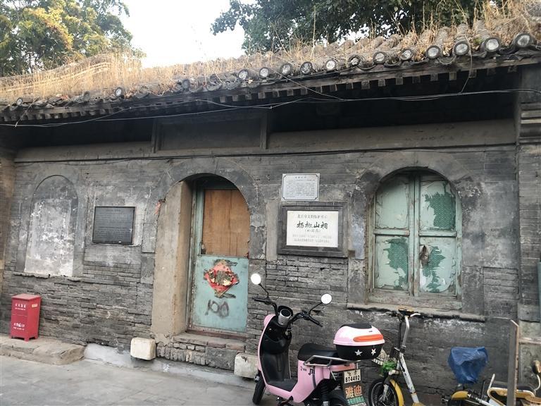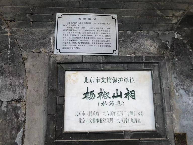 就是在這個胡同里,我看到一個歇山式屋頂?shù)姆课?,但已相?dāng)?shù)钠茢?,屋頂上長滿了凄凄荒草,門窗皆已破爛不堪。但是門旁的墻壁上卻鑲嵌著一塊匾,近前一看,上面寫著“楊椒山祠”。喲,這就是楊椒山在北京的祠。