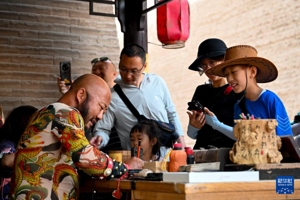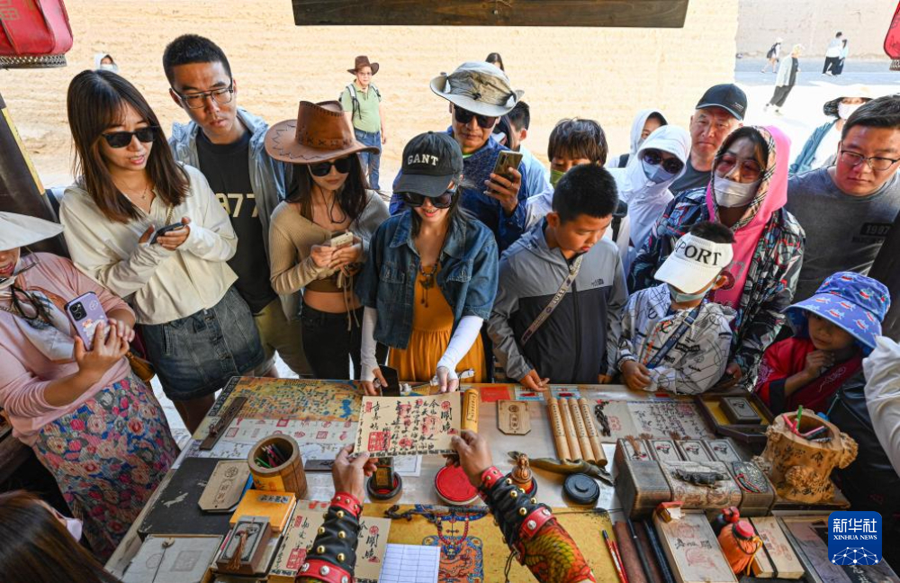 7月14日,在甘肅嘉峪關(guān)關(guān)城景區(qū),游客在李森的攤位前等待他“簽發(fā)關(guān)照”。新華社記者 陳鐘昊 攝