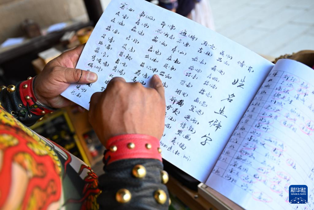 在甘肅嘉峪關(guān)關(guān)城景區(qū),李森在攤位上查閱自己編寫(xiě)的含有生僻字讀音、城市古地名等內(nèi)容的小冊(cè)子(7月14日攝)。新華社記者 陳鐘昊 攝