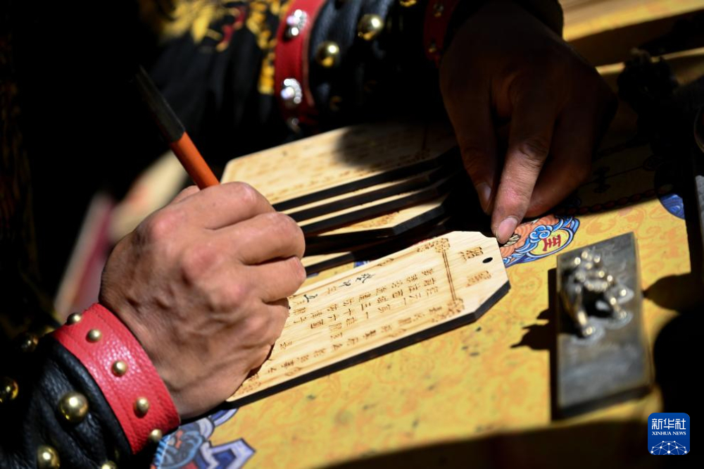 7月13日,在甘肅嘉峪關(guān)關(guān)城景區(qū),李森為游客手寫(xiě)文創(chuàng)產(chǎn)品“關(guān)照”。新華社記者 劉金海 攝