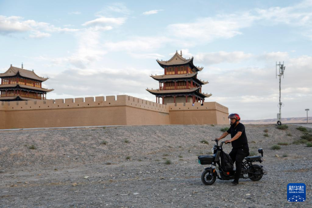 7月13日,李森結(jié)束一天的工作離開(kāi)甘肅嘉峪關(guān)關(guān)城景區(qū)騎電動(dòng)車(chē)回家。新華社記者 方欣 攝