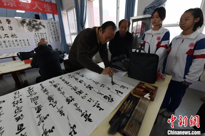 圖為書法家在蘭州交通大學(xué)附屬中學(xué)現(xiàn)場(chǎng)書法交流。戴文昌 攝