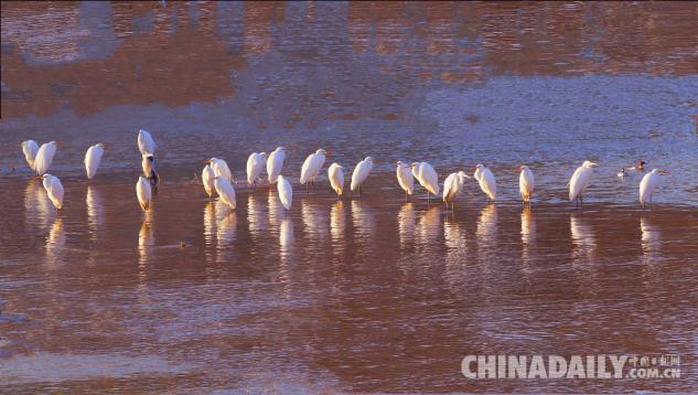 1月15日,數(shù)十只潔白的白鷺飛臨甘肅崇信城段的汭河,它們?cè)诖思Y(jié)安家。
