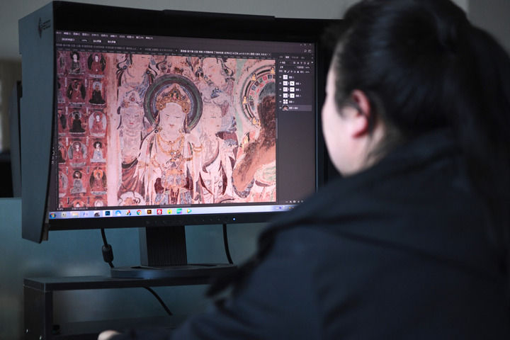 2023年4月25日,敦煌研究院文物數(shù)字化保護(hù)團(tuán)隊(duì)圖像處理人員年海麗在拼接壁畫(huà)圖像。 新華每日電訊記者 陳斌 攝