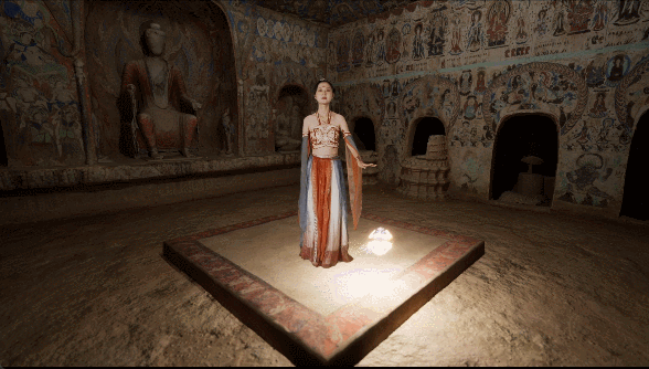 體驗過后,游客還能在虛擬演播廳,實時拍攝一段真人與洞窟虛擬場景交互的視頻。無論身處何處,打開手機(jī)便能重溫這段“帶得走”的敦煌記憶。