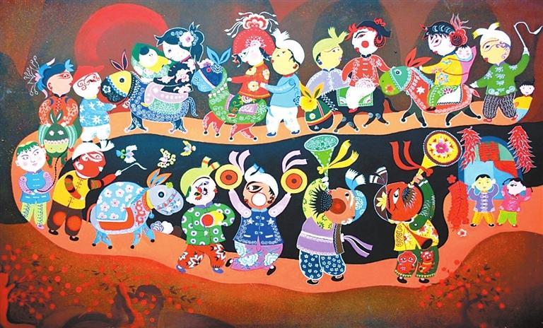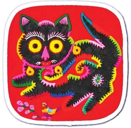 華池民間布貼畫是一種古老的民間工藝美術(shù),是隴東文化的重要組成部分。華池拼布創(chuàng)作以粗布為原料,色彩豐富鮮艷,剪貼的邊線明朗整潔,富有木刻版畫的刀木特點(diǎn)。其內(nèi)容多取材于人物、動物、花鳥等題材,注重色彩對比,以大紅大紫的色彩,夸張化的描述,追求強(qiáng)烈的直觀效果,講究裝飾性;風(fēng)格浪漫稚拙,渾厚質(zhì)樸,氣韻生動。