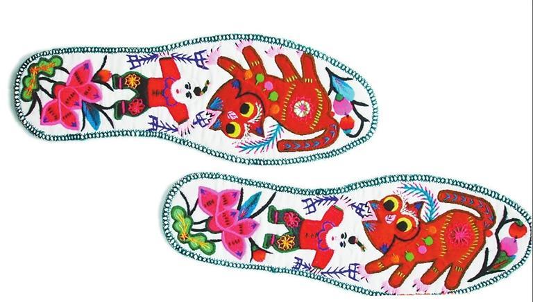 北方黃土高原,陜甘寧晉一帶,采用這種藝術(shù)縫制刺繡的衣物飾品有拼布藝術(shù)的鮮明特征,具有浮雕效果。其具體做法是將貼填繡畫相結(jié)合,有人叫做拼貼浮雕繡,在肚兜、枕頂?shù)鹊闹谱髦羞@種技藝采用最多。因為多是整體設(shè)計,分部件制作,然后組合成一個完整的畫面在布上,所以叫“逗”,“逗”是秦隴方言,就是手指把不同部件小心拼合在一起組成圖案的動作,因為布片小,要小心仔細(xì),輕輕拼合,所以會“逗裹兜”“逗夾襖”的媳婦,就是心靈手巧的人,說一個女性會“逗”,就是對她的女紅技藝的認(rèn)可。