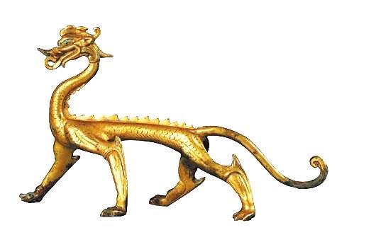 河南偃師的二里頭遺址出土了夏代龍文物,說(shuō)明此時(shí)龍已經(jīng)成為身份、地位的象征。商代開(kāi)始,龍的突出特征便是有了角,并多以夔龍紋等形象出現(xiàn)在青銅器上。春秋戰(zhàn)國(guó)時(shí)代是一個(gè)大變革、大發(fā)展的時(shí)代。與政治上諸侯爭(zhēng)雄、思想界百家爭(zhēng)鳴、陰陽(yáng)學(xué)說(shuō)盛行相適應(yīng),龍的圖案中出現(xiàn)了“群龍”和“交龍”形象。如甘肅省博物館收藏的戰(zhàn)國(guó)盤龍紋金飾片,兩條龍交叉盤繞,龍首一側(cè)飾兩條小龍,龍尾一側(cè)飾一對(duì)小虎,作咬噬龍尾狀,龍身上飾聯(lián)珠紋。隨著華夏大地結(jié)束戰(zhàn)亂,走向一統(tǒng),秦漢時(shí)代的龍出現(xiàn)相對(duì)規(guī)范和定型的趨勢(shì),并出現(xiàn)了背上長(zhǎng)翅膀的龍。魏晉南北朝時(shí)期龍形象對(duì)內(nèi)融合各少數(shù)民族文化,對(duì)外融合佛教文化,流行的龍紋頭部扁長(zhǎng),角似鹿角,發(fā)鬣后披,挺胸奮肢,呈現(xiàn)出矯健奔放、線條流暢、氣韻生動(dòng)的特點(diǎn)。