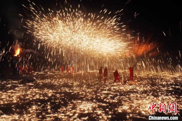 永靖王氏鑄造技藝傳承人在永靖黃河岸邊表演了國家級(jí)非物質(zhì)文化遺產(chǎn)“打鐵花”,讓民眾享受了一場視覺盛宴。侯奇志 攝