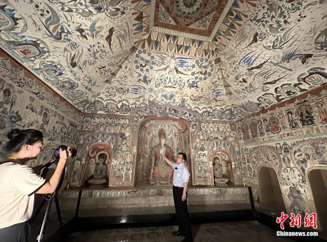 2023年7月,敦煌研究院副院長(zhǎng)張?jiān)衷诙鼗湍呖叩?85窟原大復(fù)制窟內(nèi),接受中新社“東西問(wèn)”獨(dú)家專(zhuān)訪。丁思 攝