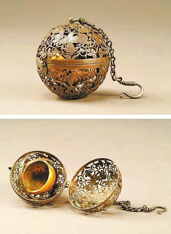 香囊最出彩的地方是機(jī)環(huán)常平架技術(shù),是一種利用球體內(nèi)兩個(gè)同心機(jī)環(huán)與中央焚香盂之間的重力作用,使其在自由轉(zhuǎn)動的時(shí)候,始終能保持平衡的機(jī)械原理。唐代的香囊豐富多樣,這種金屬造型的香囊設(shè)計(jì)更為機(jī)巧精致,深受妃后、貴婦們所推崇喜愛,它上承漢代的常平架技術(shù),下延現(xiàn)代陀螺儀萬向支架技術(shù),是中國古代科學(xué)技術(shù)與手工藝技術(shù)對世界的杰出貢獻(xiàn)。