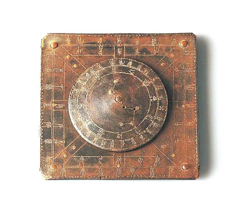 1972年武威市磨嘴子漢墓出土的這件漆栻盤,直徑6厘米,厚1厘米,地盤邊長9厘米,木胎,髹深褐色漆。由圓形的天盤和方形的地盤構(gòu)制而成,天盤位于地盤之上,正中心以竹軸貫聯(lián),使天盤可以轉(zhuǎn)動。天盤中陰刻兩個(gè)同心圓,將其分為三區(qū):內(nèi)區(qū)以竹珠鑲嵌北斗七星,星間刻線相連,斗柄中節(jié)穿過圓心。中區(qū)內(nèi)隸書陰刻十二月神,外區(qū)陰刻篆書二十八宿名。地盤以兩個(gè)相套的正方形分為三區(qū):內(nèi)區(qū)納天盤,中區(qū)陰刻篆書十天干中的八干(不刻戊己)和十二地支名,外區(qū)陰刻篆書二十八宿名。