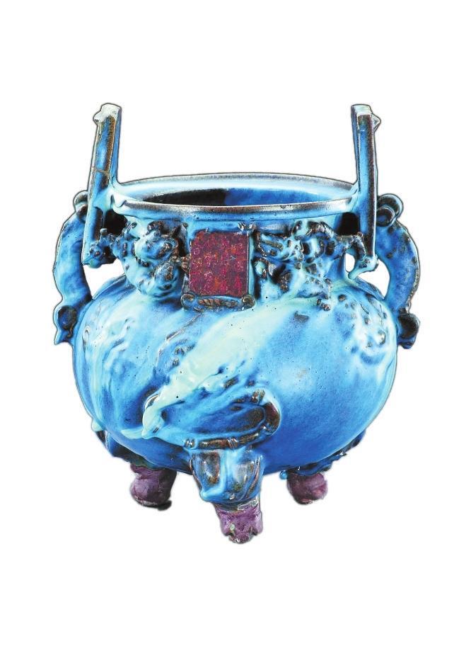 香爐整體造型為雙立耳,圓鼓腹,三獸足,體形較大。頸部雕貼三只麒麟,正面有一初方形題記,刻有“己酉年九月十五小宋自造香爐一個(gè)”共計(jì)15字,經(jīng)考證:“己酉年”是公元1309年,屬于元代中期。香爐通體施天青色釉,釉層較厚,在高溫中由于積釉濃淡不一,縱橫流淌到器表各處,形成天青、天藍(lán)、灰藍(lán)等不同釉面,再與紅褐色的露胎對比,有了銅器般的金屬質(zhì)感。