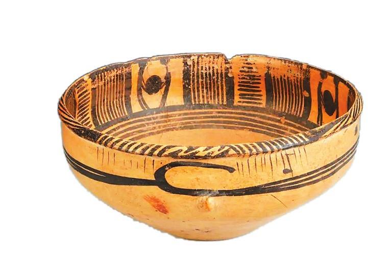 這件距今5000多年的古代彩陶作品,制作精致,圖案精美,人物形體鮮明,造型和動作既抽象又生動。彩陶盆通高11.3厘米,口徑24.5厘米,底徑9.8厘米,細(xì)泥制作,唇外侈,略鼓腹,腹部兩側(cè)有對稱的小鈕??谘貎?nèi)壁為四組雙人抬物圖案,中間以橫豎線條組成的幾何圖案間隔,形成一周四方連續(xù)的紋飾帶,繪制于陶盆內(nèi)側(cè)上部,二人的頭部以圓點(diǎn)代表,軀干和四肢以線條描繪。兩人相向站立,共同抬起一個(gè)碩大的圓形物體,畫面簡潔而生動,寥寥數(shù)筆就將人抬重物時(shí)雙腿開立、腰背微屈用力的形態(tài)刻畫得惟妙惟肖。陶盆上精妙的紋飾讓它成為我國最早在彩陶上表現(xiàn)原始先民勞作場景的藝術(shù)珍品。