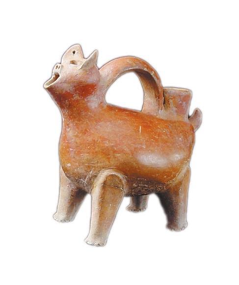 紅陶獸形壺,高21.6厘米,夾砂紅陶,通體磨光,遍施紅色陶衣,光潤亮澤。器型圓面聳耳,拱鼻,張口,耳穿小孔,四肢粗壯,短尾上翹,背裝弧形提手,尾根部一筒形注水口,嘴可往外倒水,腹部鼓起加大了容積,四足立起可供加熱,使用方便,造型生動美觀,集實(shí)用與仿生藝術(shù)于一身,是大汶口文化獨(dú)有的器形,充滿了創(chuàng)造性的靈感,是新石器時(shí)代一件難得的陶器珍品。
