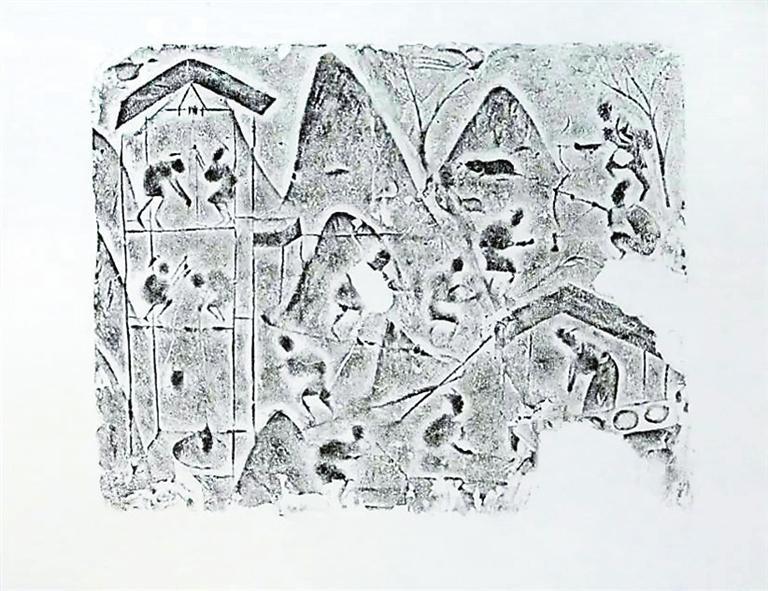 巴蜀地區(qū)是中國乃至世界鹽業(yè)最早的起源地之一,史載戰(zhàn)國時(shí)期巴蜀就已開鑿鹽井、汲鹵煮鹽。秦在此設(shè)鹽官,至漢代,四川地區(qū)的井鹽制作已經(jīng)具有一定的規(guī)模,分工細(xì)致,工具完備。此畫像磚表現(xiàn)了漢代制鹽的情景:畫面左下角有高聳的井架,架上安置有轆轤,用以轉(zhuǎn)動系在繩索上的吊桶,交替吸鹵,高架旁有一鹵槽,將鹵引入煮鹽的釜內(nèi),釜下架設(shè)有灶,有人正奮力用扇燒起熊熊烈火。
