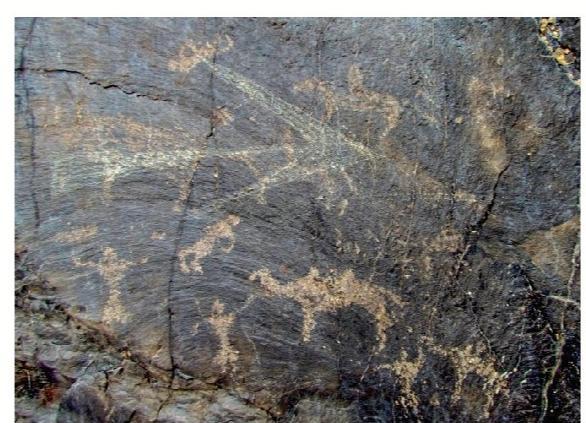 黑山巖畫全稱為“黑山摩崖淺石刻巖畫”,分布于嘉峪關(guān)西北約 10—20公里處的黑山峽谷陡崖峭壁上,為遠(yuǎn)古時期黑山地區(qū)游牧民族生產(chǎn)、生活的真實(shí)記錄?,F(xiàn)共發(fā)現(xiàn)分布在黑山石關(guān)峽口、磨子溝、蕉蒿溝、四道股形溝、紅柳溝、交河溝六處戰(zhàn)國至明代時期的巖畫,共 157 幅。黑山巖畫反映的時限跨度大,時空關(guān)系復(fù)雜,涉及部族較多。畫面所反映的內(nèi)容豐富多彩,有動物、人物、佛塔、植物等,還有大型的操練舞蹈場景。涉及人類學(xué)、社會學(xué)、歷史學(xué)、考古學(xué)、美術(shù)學(xué)、生物學(xué)、地理學(xué)等多個學(xué)科,具有較高的研究價值。