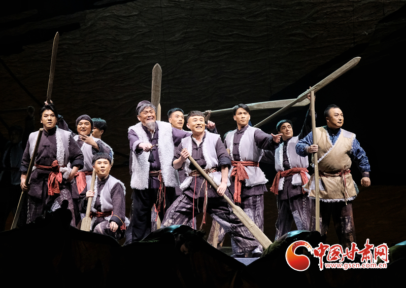 首演當晚,一曲黃河特色的“花兒”開場,將觀眾帶回到20世紀30年代末蘭州筏客子在黃河激流中勇敢拼搏的時代。劇中,筏客子們在經歷了碼頭爭奪、蘭州遭受日軍轟炸、金城壯烈犧牲等重重考驗后,在國家危難時刻,舍棄個人恩怨,團結起來支援抗戰(zhàn),組成水上大型運輸隊,將大量物資安全送達抗戰(zhàn)前線。