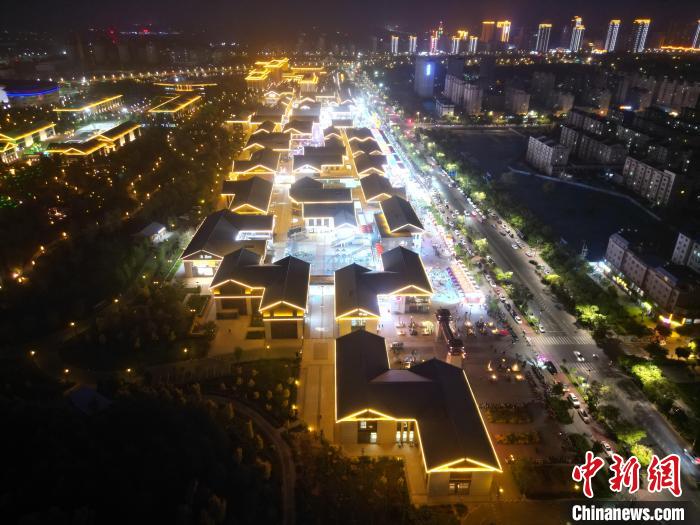 圖為明清街夜市燈光點亮具有武威文化元素的“天梯山石窟”彩燈。(無人機照片)  戴文昌 攝