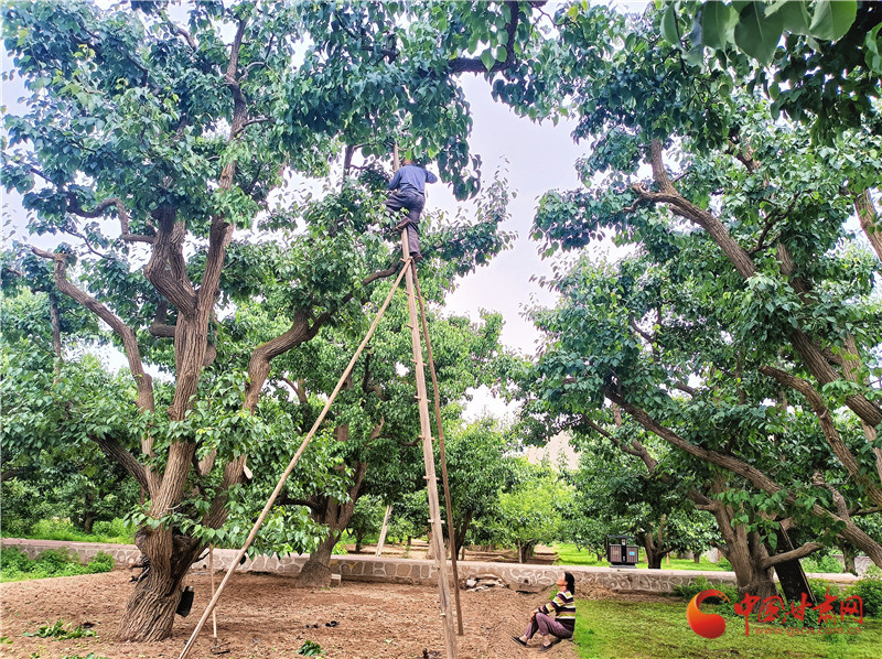 初夏走進(jìn)古梨園,梨樹(shù)進(jìn)入疏果期,腳登“蜈蚣梯”的“天把式”又開(kāi)始忙碌了。