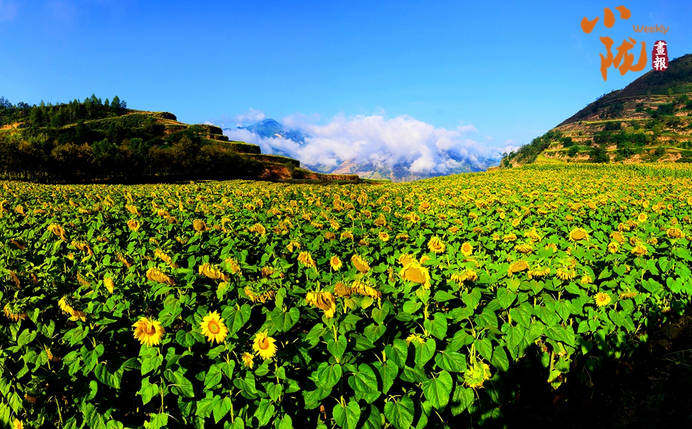 盛開的向日葵,迎著朝陽,競相綻放,婀娜多姿,在藍(lán)天白云下,卷起花的浪朵,匯聚成碧波蕩漾、金光閃閃的海洋,讓人心曠神怡。