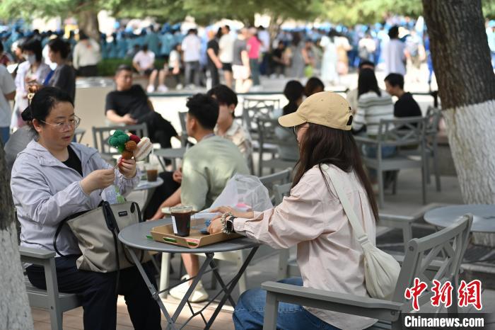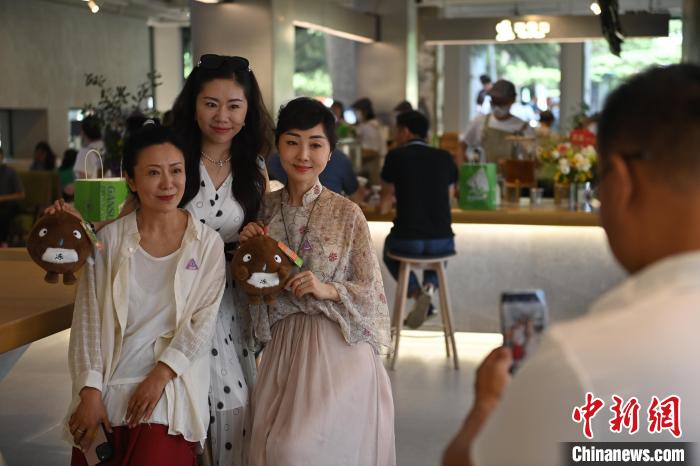 6月19日,甘肅省博物館藝術(shù)生活館在甘肅蘭州開館。該館是甘肅省博物館打造的一處復(fù)合型高價(jià)值文化空間,融合了咖啡、烘焙、展覽、藝術(shù)書店、文創(chuàng)銷售等多樣化業(yè)態(tài)。圖為顧客與蘭州凍梨文創(chuàng)真人玩偶合影。中新社記者 李亞龍 攝