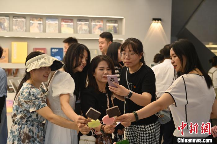 6月19日,甘肅省博物館藝術(shù)生活館在甘肅蘭州開館。該館是甘肅省博物館打造的一處復(fù)合型高價(jià)值文化空間,融合了咖啡、烘焙、展覽、藝術(shù)書店、文創(chuàng)銷售等多樣化業(yè)態(tài)。圖為游客挑選蘭州凍梨文創(chuàng)玩偶。中新社記者 李亞龍 攝