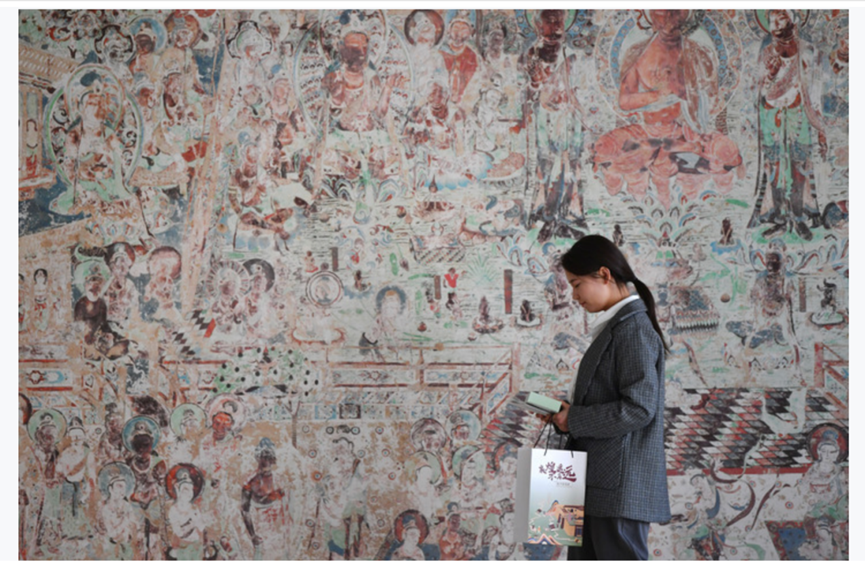 圖為敦煌研究院文物數(shù)字化保護(hù)團(tuán)隊創(chuàng)意營銷人員廖雪婷從一幅高保真復(fù)制壁畫前走過(2023年4月25日攝)。新華社記者陳斌攝
