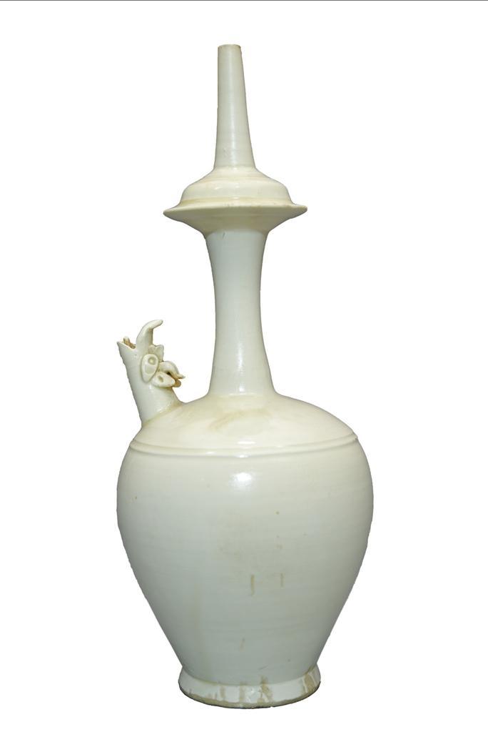 胎白質(zhì)細(xì)堅(jiān)致,釉白泛黃,底足無釉。采用堆塑技法,小口長頸,頸中部飾一相輪狀圓盤,下頸束腰,圓肩鼓腹下收,圈足外撇。肩腹交接處飾弦紋三道,肩的一側(cè)塑龍首流。