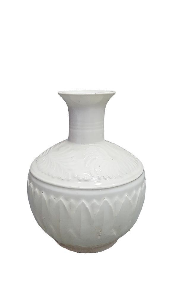 胎白質(zhì)細(xì)堅(jiān)致,釉白瑩潤光亮。采用刻花技法。長頸呈喇叭口,圓唇。頸中部飾凹弦紋三道,器內(nèi)無釉。圓肩飾左右對(duì)稱的菊花紋,前后飾方向一致的菊葉紋。肩腹交接處飾凹弦紋一道,腹稍鼓下收,腹?jié)M刻三疊仰蓮紋。矮圈足,足底無釉,修足刀削痕明顯。