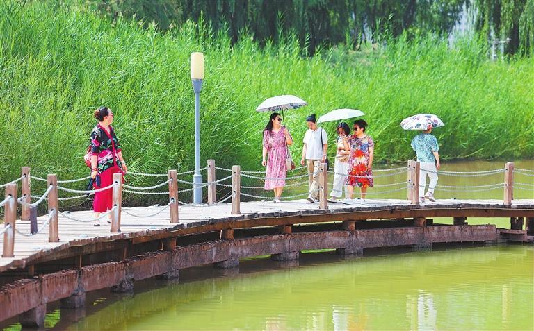 盛夏時節(jié),蘭州銀灘濕地公園綠意盎然、空氣清新。游客紛紛來到這里,享受炎炎夏日的片刻清涼。