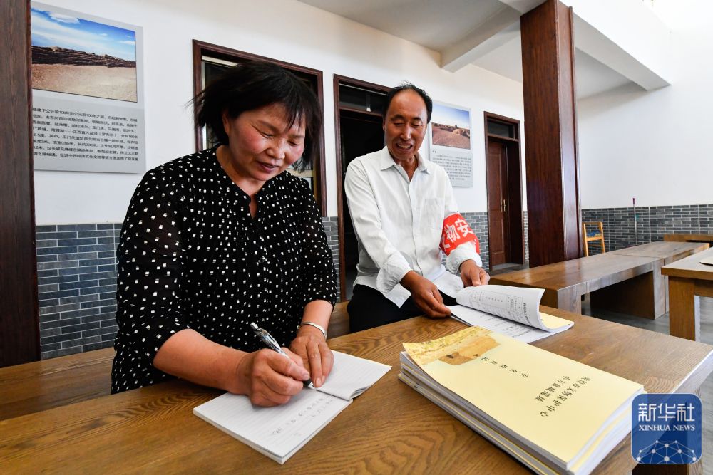 ↑7月16日,張吉全和聞春瑜在漢長(zhǎng)城文物保護(hù)管理用房?jī)?nèi)寫巡護(hù)日記。